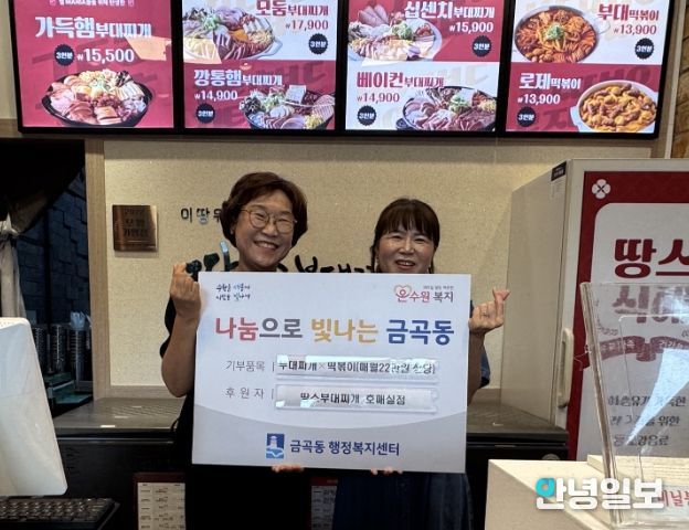 안녕일보 배윤 기자 | 수원시 권선구 금곡동 행정복지센터는 지난 18일, 관내 '땅스부대찌개' 호매실점과 함께 “이웃돕기 나눔 전달식”을 진행했다고 밝혔다.