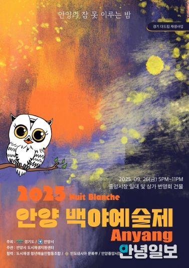 안녕일보 배윤 기자 | 안양시는 이달 26일 오후 5시부터 11시까지 만안구 안양4동 안양중앙시장에서 청년들이 즐길 수 있는 ‘안양 백야예술제(Nuit Blanche Anyang)’를 개최한다고 19일 밝혔다.