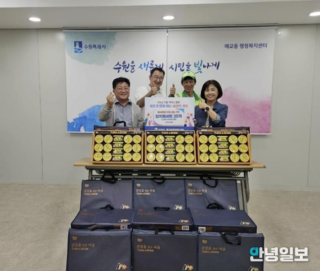 안녕일보 배윤 기자 | 수원시 팔달구 매교동 관내 청소업체인 ㈜대일실업은 지난 22일 수원시 팔달구 매교동행정복지센터에 관내 어려운 이웃에게 100만원 상당의 추석명절 참치햄 선물세트 30개를 기부하여 따뜻한 이웃 나눔을 실천했다.