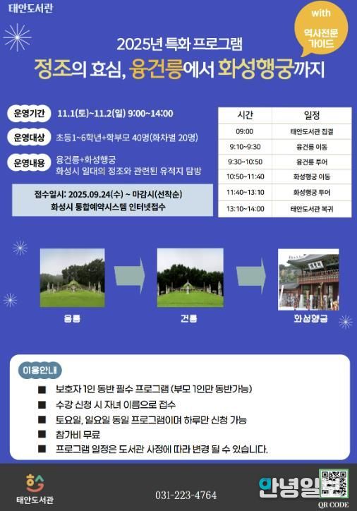안녕일보 배윤 기자 | 화성시문화관광재단 태안도서관은 오는 2025년 11월 1일부터 2일까지 이틀간 초등학생 1~6학년과 학부모를 대상으로 특별한 역사 체험 프로그램인 ‘정조의 효심, 융건릉에서 화성행궁까지’ 정조 관련 유적지 탐방 프로그램을 운영한다.