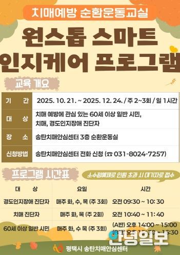 현재 4기 참여자에 대한 접수를 받고 있으며, 신청 대상은 치매 고위험군뿐 아니라 치매 예방에 관심 있는 만 60세 이상 주민 누구나 가능하다. 참여 희망자는 송탄치매안심센터로 문의하면 된다.