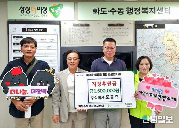 안녕일보 배윤 기자 | 남양주시는 24일 화도읍에 소재한 제조 업체인 ㈜포블릭이 추석 명절을 앞두고 후원금 150만 원을 화도읍 지역사회보장협의체에 기탁했다고 밝혔다.