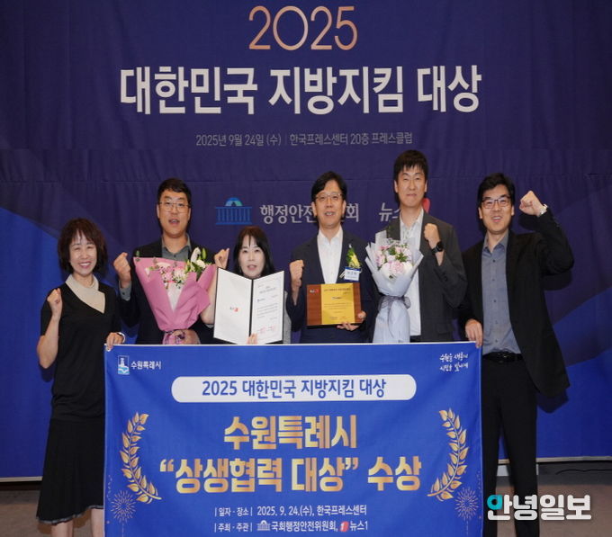 안녕일보 배윤 기자 | 수원특례시는 24일 한국프레스센터 프레스클럽에서 열린 ‘2025 대한민국 지방지킴 대상’에서 ‘상생협력’ 부문 대상을 받았다.