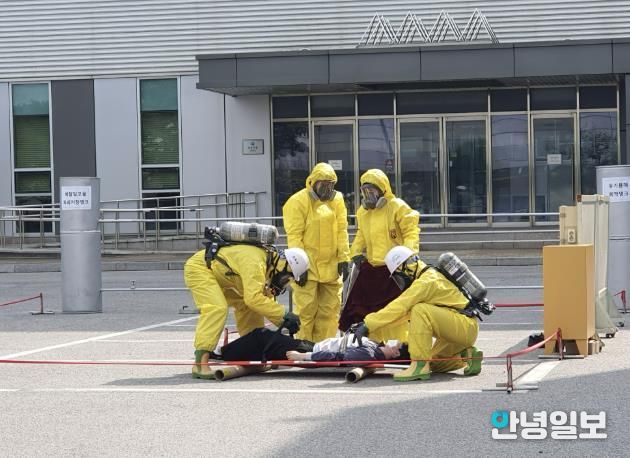 유해화학물질인 메틸 알코올 누출로 인한 화재 상황을 설정해 진행한 이 훈련은 자체 매뉴얼에 따라 ▲비상 상황 긴급전파 ▲소방대 초동 조치 ▲화재 진압 ▲인명구조 ▲사고 복구 등으로 구성됐다.