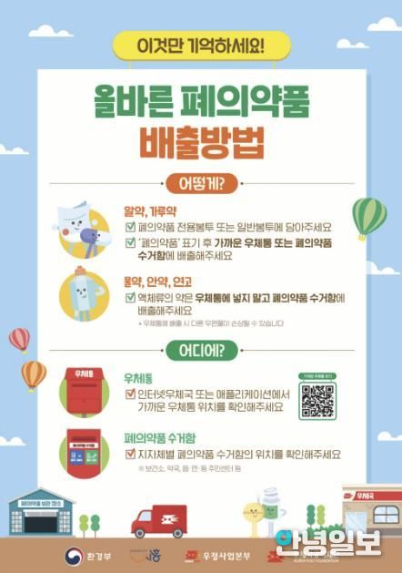 가정에서 발생한 폐의약품은 회수 봉투나 일반 편지 봉투에 ‘폐의약품’이라고 표시해 밀봉한 후 가까운 우체통에 넣으면 된다. 우체국이 이를 회수해 시흥시청에 전달하면 안전하게 처리된다. 다만, 액상 의약품은 우편물 훼손 우려가 있어 기존 보건소나 행정복지센터 전용 수거함을 이용해야 한다.