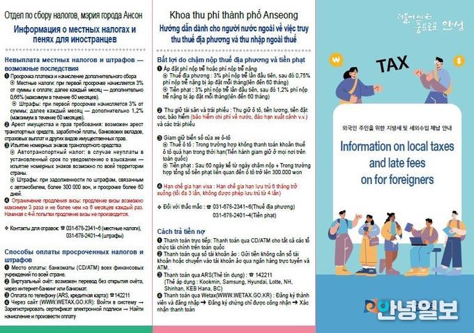 이에 따라 외국인 맞춤형 납세 홍보 수단으로 기존의 영어·중국어·베트남어 3개국 언어로 제작한 체납 안내 리플렛에 러시아어를 추가하여 4개국 언어로 새롭게 제작했고, 포스터, 안내 전단지 등과 함께 외국인 관련 시설 및 단체와 읍·면·동사무소에 비치한다. 외국인이 많이 거주하는 지역에 대한 집중 홍보를 통해 납부 방법과 체납에 따른 불이익을 안내하여 자진납부할 수 있도록 유도할 계획이다.