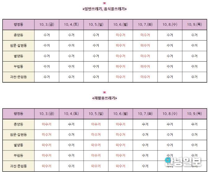 생활폐기물 수거는 일반 쓰레기의 경우 3일, 4일, 5일, 8일, 9일에, 재활용 쓰레기는 4일, 7일, 8일, 9일에 각각 수거된다.