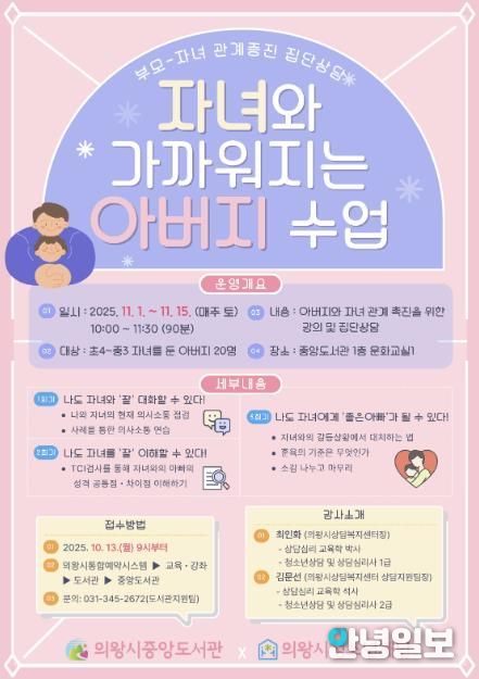 안녕일보 배윤 기자 | 의왕시 중앙도서관은 사춘기 자녀와의 관계에서 어려움을 겪고 있는 아버지를 위한 부모 집단상담 프로그램 ‘자녀와 가까워지는 아버지 수업’을 운영한다.