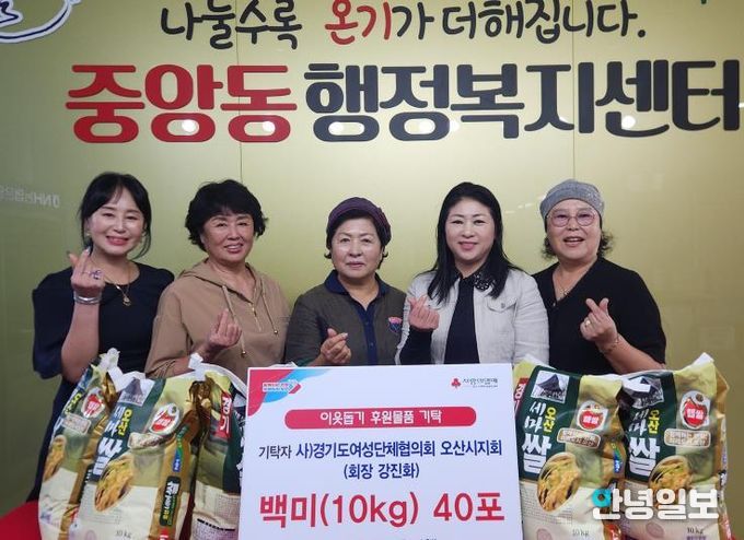 안녕일보 배윤 기자 | 사단법인 경기도여성단체협의회 오산시지회는 지난 10월 1일, 추석 명절을 앞두고 지역 내 어려운 이웃을 위해 백미(10kg) 5포씩을 오산시 관내 8개 동 행정복지센터에 각각 기탁했다.