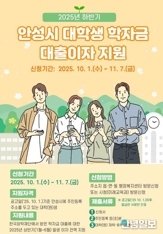 안녕일보 배윤 기자 | 안성시는 오는 10월 1일부터 11월 7일까지 ‘2025년도 하반기 안성시 대학생 학자금 대출이자’ 지원 신청을 받는다.