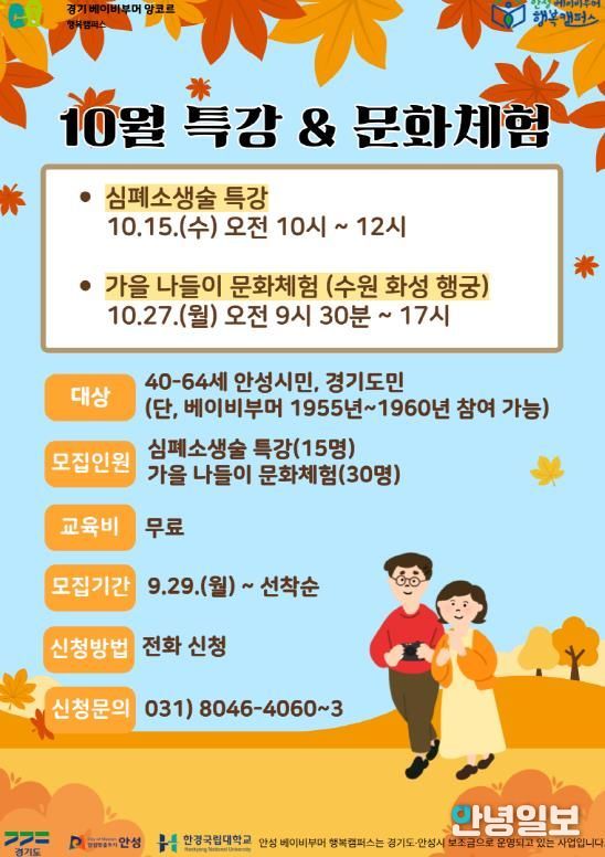 안녕일보 배윤 기자 | 안성 베이비부머 행복캠퍼스(한경국립대학교 평생교육원)는 오는 10월 15일부터 27일까지 중장년 안성시민(경기도민)을 대상으로 ‘10월 특강(심폐소생술) 및 문화체험(수원화성행궁)’ 프로그램을 운영한다고 밝혔다.