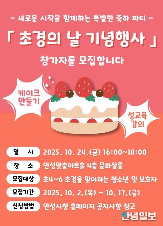 안성시 관계자는 “다가오는 행사가 또래 친구들과 함께 초경을 축하하고 경험을 나누는 소통과 공감의 장이 되길 바란다”며, “이를 통해 초경에 대한 긍정적 인식이 확산되는 계기가 되기를 기대한다”고 전했다.