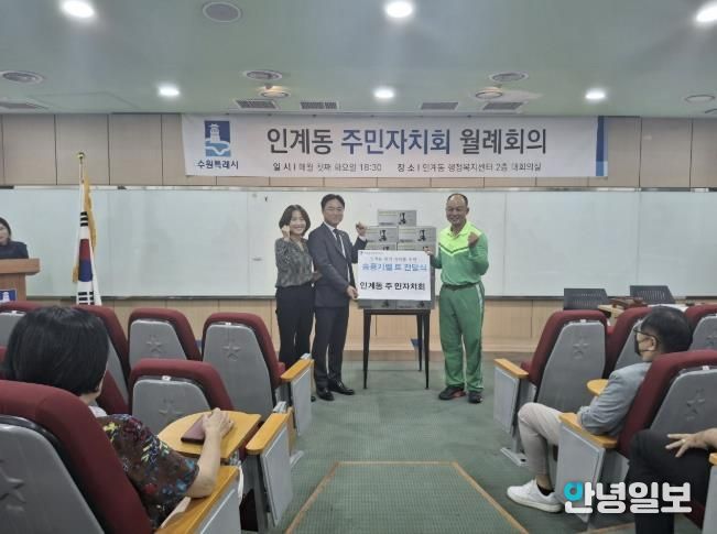 안녕일보 배윤 기자 | 수원시 팔달구 인계동 주민자치회는 지난 10월 1일, 가을철 관내 낙엽청소용 송풍기 벨트(100만 원 상당)를 인계동 행정복지센터에 전달했다.
