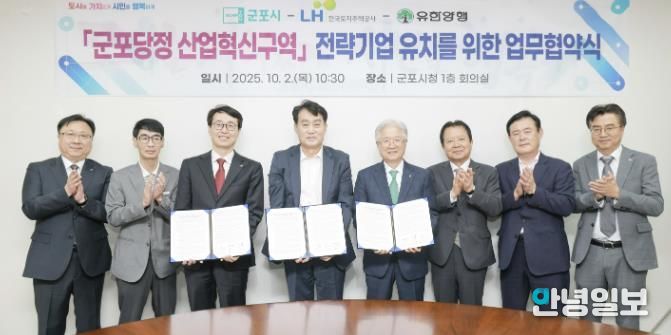 안녕일보 배윤 기자 | 군포시는 2일 군포시청에서 한국토지주택공사(LH), ㈜유한양행과 ‘군포당정 산업혁신구역’ R·D 전략기업 유치를 위한 업무협약을 체결했다고 밝혔다.