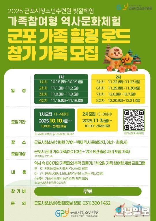 안녕일보 배윤 기자 | 군포시청소년재단이 운영하는 군포시청소년수련원(충남 청양)은 관내 가족을 대상으로 2025년 가족참여형 역사문화탐방 '군포가족 힐링로드' 참가자를 모집한다.