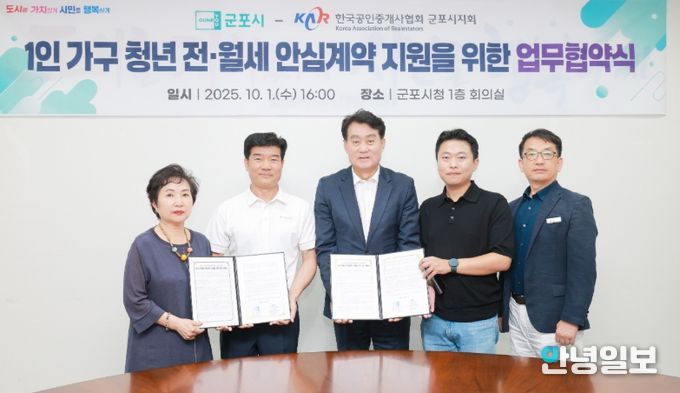 안녕일보 배윤 기자 | 군포시는 10월 1일 시청 1층 회의실에서 한국공인중개사협회 군포시지회와 청년 1인 가구 전월세 안심계약 지원을 위한 업무협약을 체결했다.