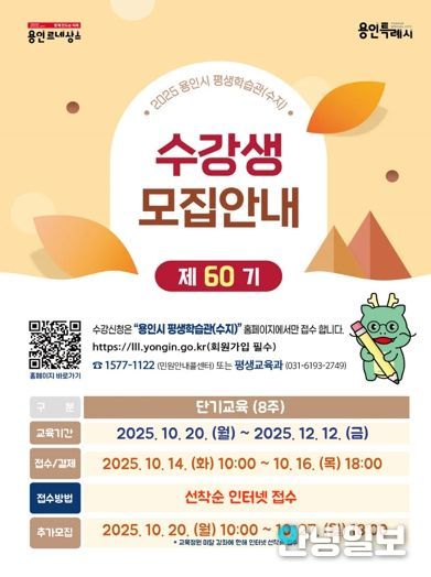 접수는 14일부터 16일까지 용인시 평생학습관 홈페이지에서 선착순으로 받는다.