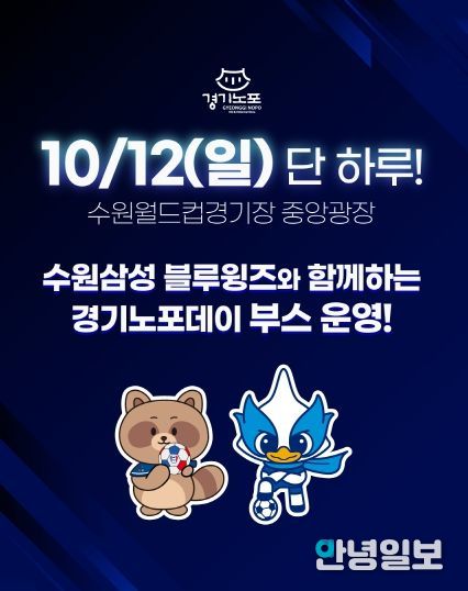 12일 오전 11시부터 수원월드컵경기장 중앙광장에서 진행되는 경기노포 홍보 부스 및 뽑기 이벤트를 통해 경기노포 바우처 등 다양한 경품을 받을 수 있다. 또 경기 중 하프타임 전광판 게임 이벤트를 통해 추가 경품을 증정할 예정이다. 자세한 내용은 9일 오후부터 수원삼성블루윙즈 공식 SNS를 통해 확인할 수 있다.