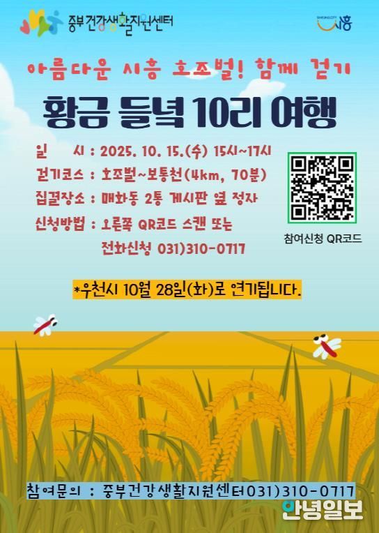 안녕일보 배윤 기자 | 시흥시는 오는 10월 15일 오후 3시부터 5시까지 호조벌 일대에서 ‘황금 들녘 10리 여행 걷기 행사’를 연다.