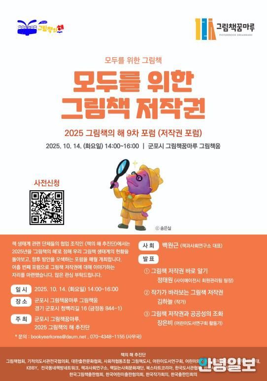 군포시 그림책꿈마루와 2025년 그림책의 해 추진단이 공동 주최하고 백원근 책과사회연구소 대표의 사회로 진행되는 이번 포럼은 ‘모두를 위한 그림책 저작권’이라는 주제로 전문가, 작가, 시민들이 함께 참여하여 그림책 저작권 침해사례와 저작권 보호 및 인식개선방안에 대하여 심도있는 논의를 할 예정이다.