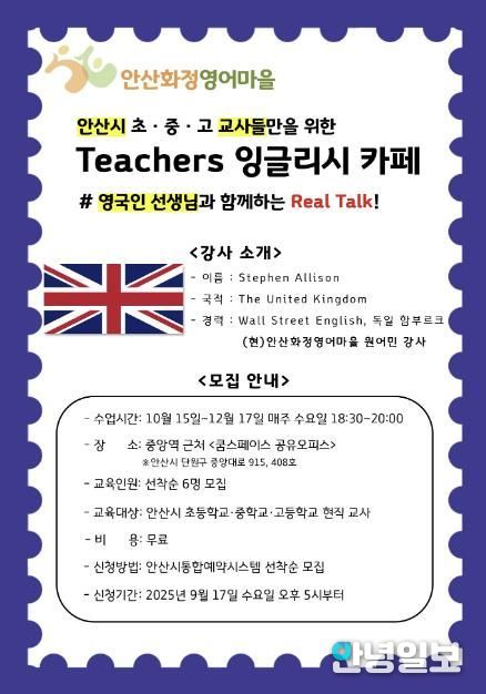 안녕일보 배윤 기자 | 안산시 안산화정영어마을은 오는 15일부터 12월 17일까지 관내 소속 교사를 대상으로 ‘티처스(Teachers) 잉글리시 카페’를 운영한다고 10일 밝혔다.