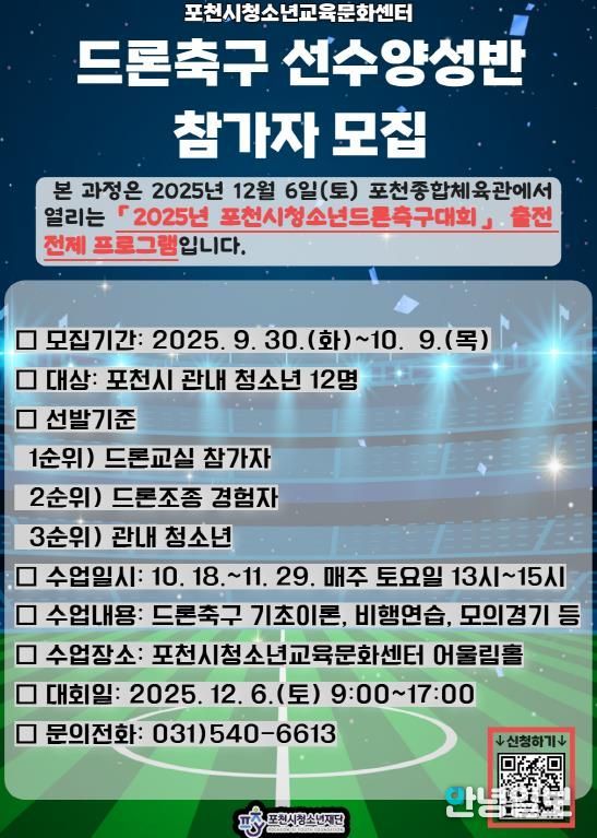 안녕일보 배윤 기자 | 포천시청소년재단 포천시청소년교육문화센터는 오는 10월 18일부터 11월 29일까지 매주 토요일, ‘드론축구 선수양성반’을 운영한다.