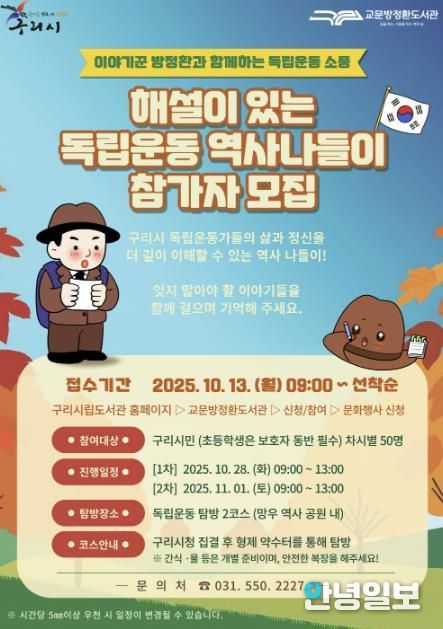 안녕일보 배윤 기자 | 구리시는 오는 10월 13일부터 27일까지 교문 방정환 도서관에서 진행하는 ‘해설이 있는 독립운동 역사 나들이’ 프로그램의 참여자를 모집한다고 밝혔다.