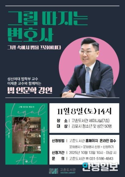 안녕일보 배윤 기자 | 김포시 고촌도서관에서 오는 11월 8일 오후 2시부터 4시까지 예술작품 속에 숨은 법률 이야기를 주제로 한 인문학 강연을 운영한다.