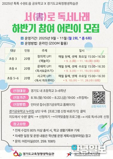 안녕일보 배윤 기자 | 경기도교육청평생학습관이 수원교육지원청과 함께 어린이 독서 습관 형성과 사고력 향상을 위하여 초등학교 3~6학년을 대상으로‘서(書)로 독서나래’를 운영한다.