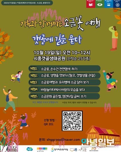 참가 신청은 홍보물에 안내된 정보무늬(큐알 코드)를 통해 온라인으로 하면 되고, 선착순 25가족을 모집한다. 모집 관련 궁금한 사항은 시흥갯골사회적협동조합로 문의하면 된다.