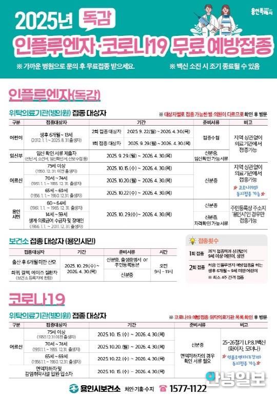 안녕일보 배윤 기자 | 용인특례시는 10월 15일부터 내년 4월 30일까지 지역 내 290개 위탁의료기관에서 코로나19 무료 예방접종을 시작한다고 13일 밝혔다.