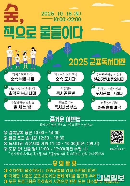 안녕일보 배윤 기자 | 군포시가 민선 8기 공약인 ‘책의 도시 축제 활성화’를 실현하기 위해 오는 10월 18일 초막골생태공원에서 ‘2025 제11회 군포독서대전’을 개최한다.