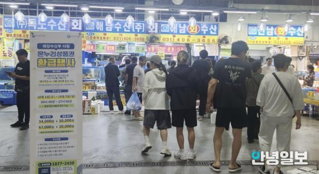 이번 행사는 해양수산부 지원으로 수산물 소비촉진과 도매시장 이용 활성화를 위해 마련된 것으로, 수산동 26개 점포가 참여해 국내산 수산물 구매 시 구매금액의 일부를 온누리상품권으로 즉시 환급하는 혜택을 선보였다.