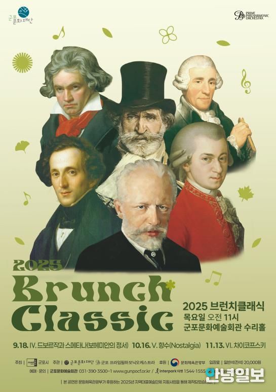 ‘2025 브런치클래식’은 군포문화재단과 군포 프라임필하모닉오케스트라가 주관하여 각 달마다 어울리는 다양한 클래식을 오케스트라 연주에 해설을 곁들여 시민들에게 평일 오전, 수준 높은 클래식 감상 기회를 제공한다.
