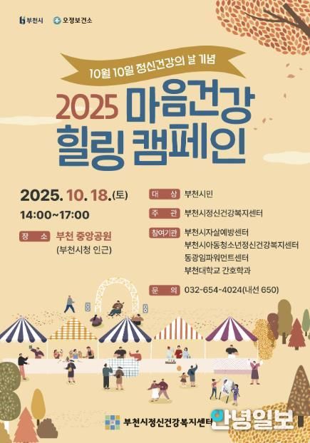 안녕일보 배윤 기자 | 부천시는 부천시정신건강복지센터와 함께 2025년 정신건강의 날(10월 10일)을 기념해 10월 18일 오후 2시부터 부천중앙공원에서 ‘2025 마음건강 힐링캠페인’을 연다.