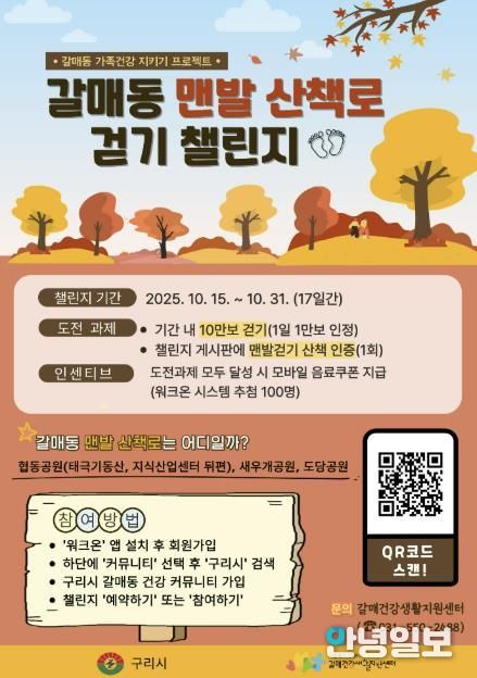 안녕일보 배윤 기자 | 구리시는 가을철 주민들의 건강한 생활 습관 형성과 스트레스 완화를 위해 ‘갈매동 맨발 산책로 걷기 챌린지’를 오는 10월 15일부터 31일까지 17일간 운영한다고 밝혔다.