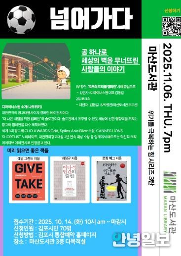 안녕일보 배윤 기자 | 마산도서관은 오는 11월 6일 19시, 본관 3층 다목적실에서 ‘공 하나로 세상의 벽을 무너뜨린 사람들의 이야기’ 프로그램을 운영한다고 밝혔다.