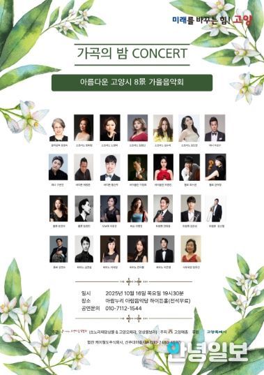 안녕일보 배윤 기자 | 고양특례시가 후원하고, (사)한국예술문화단체총연합회 고양지회가 주최하며 (사)한국음악협회 고양지부가 주관하는 ‘2025 가곡의 밤 – 아름다운 고양시 8경(景) 가을 음악회’가 오는 16일 오후 7시 30분, 고양아람누리 아람음악당에서 개최된다.