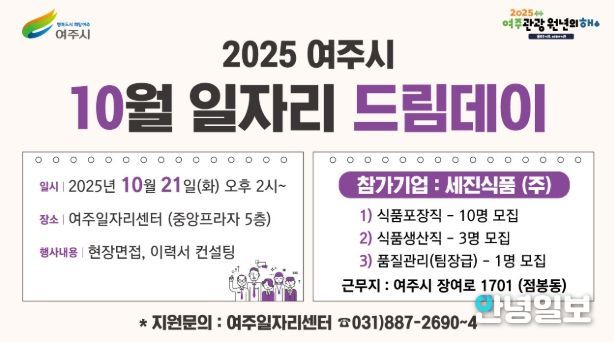 안녕일보 배윤 기자 | 여주시는 오는 10월 21일 오후 2시 여주일자리센터(세종로 14번길 18, 중앙프라자 5층)에서 ‘2025년 10월 일자리드림데이’를 연다.