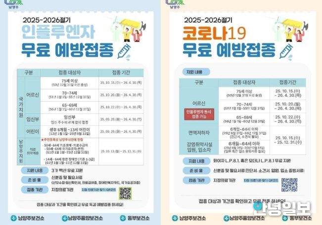 안녕일보 배윤 기자 | 남양주시는 9월 22일부터 내년 4월 30일까지 ‘2025-2026절기 코로나19·인플루엔자 예방접종 사업’을 추진한다고 밝혔다.