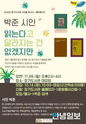 안녕일보 배윤 기자 | 김포시 장기도서관은 2025년 공공도서관 독서프로그램 운영 지원사업으로 '시인을 만나다-박준 시인'을 오는 11월 9일, 오후 2시부터 4시까지 장기도서관 대강당에서 운영한다고 밝혔다