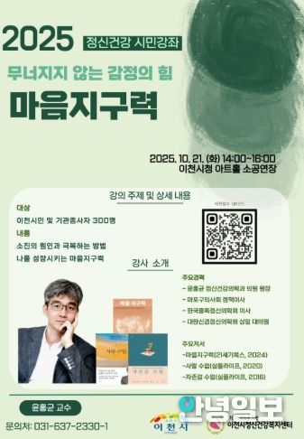 안녕일보 배윤 기자 | 이천시정신건강복지센터는 오는 10월 21일 오후 2시부터 4시까지 이천아트홀 소공연장에서 2025년 정신건강 시민강좌 ‘무너지지 않는 감정의 힘, 마음 지구력’을 개최한다. 이번 강좌는 취업, 학업, 결혼 등 다양한 스트레스 환경 속에서 살아가는 이천 시민들에게 마음 건강의 중요성을 알리고 정신건강 회복의 계기를 마련하기 위해 기획됐다.