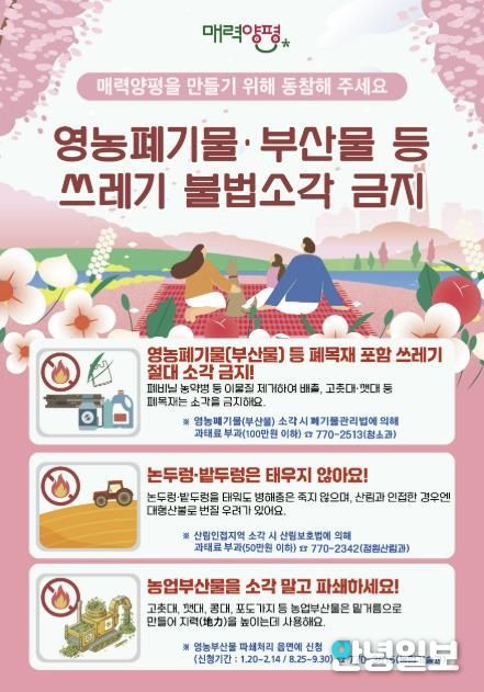 전진선 양평군수는 “불법소각은 미세먼지 등 환경오염의 주요 원인일 뿐 아니라, 대형 산불과 같은 재난사고로 이어질 수 있다”며 “불법소각을 근절하기 위해서는 군민 여러분의 적극적인 협조가 필요하며, 불법행위 발견 시 즉시 신고해 주시길 바란다”고 강조했다. 이어 “양평군은 앞으로도 지속적인 단속과 함께 교육과 홍보를 강화해 깨끗하고 안전한 환경 조성을 위해 최선을 다하겠다”고 덧붙였다.