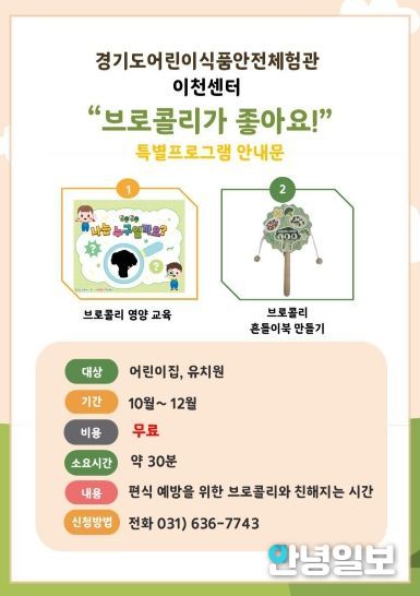 안녕일보 배윤 기자 | 이천시 어린이식품안전체험관은 오는 10월부터 12월까지 특별프로그램 ‘브로콜리가 좋아요’를 운영한다고 밝혔다.