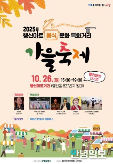 안녕일보 배윤 기자 | 고양특례시는 오는 26일 오후 3시 30분부터 오후 7시 30분까지 ‘행신아트 음식문화 특화거리 가을축제’를 행신아트거리 일대에서 개최한다고 밝혔다.
