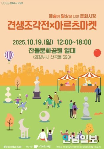 첫 번째는 10월 19일 12시부터 18시까지 잔돌문화공원(산곡동 693)에서 열리는 '견생조각전×아르츠마켓'이다. 의정부문화재단과 고산주민자치회가 공동 기획한 이 행사는 '비어 있던 풍경, 견생조각전(見生彫刻展)으로 채우다 - 고산동 작은 영웅들과 함께하는 어울림 한마당'으로 진행된다. 20여 개의 아르츠마켓 부스는 물론, 야외 조각전시와 다채로운 공연이 더해져 시민들에게 문화 향유의 폭을 넓힐 것으로 기대된다.