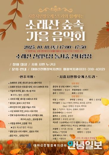 안녕일보 배윤 기자 | 시흥시 대야ㆍ신천행정복지센터는 오는 10월 18일 소래산 삼림욕장 놀자숲 잔디광장에서 대야ㆍ신천동 지역 주민을 위한 ‘소래산 숲속 가을 음악회’를 개최한다.