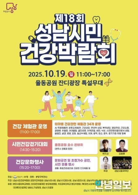 안녕일보 배윤 기자 | ‘제18회 성남시민 건강박람회’가 오는 10월 19일 오전 11시~오후 5시 율동공원 잔디광장에서 열린다.