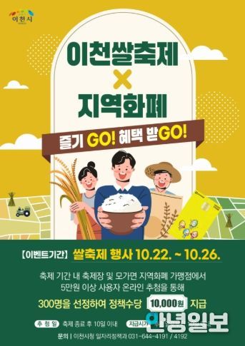 안녕일보 배윤 기자 | 이천시는 2025 이천쌀문화축제 기간에 지역화폐 이용을 촉진하고 지역경제를 활성화하기 위해 코나아이(주)의 경기지역화폐 사회공헌 재원을 활용하여 ‘이천쌀축제, 지역화폐로 즐기고(GO), 혜택받고(GO)’ 이벤트를 추진한다고 밝혔다.
