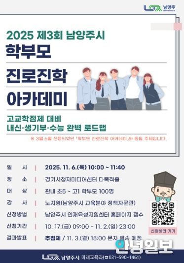 안녕일보 배윤 기자 | 남양주시는 오는 11월 6일 경기시청자미디어센터 다목적홀에서 열리는 ‘학부모 진로진학 아카데미’ 참여자를 10월 17일부터 11월 2일까지 모집한다고 밝혔다.